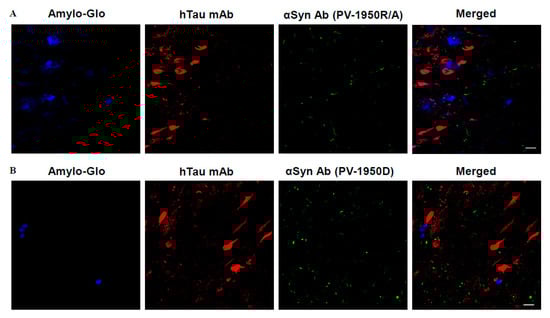 It is known that hα-Syn pathology in AD is associated with a more aggressive disease course and accelerated cognitive dysfunction []. Our data supported this observation and demonstrated that IgG antibodies purified from mice vaccinated with PV-1950R/A and PV-1950D recognized pathological hα-Syn in amygdala (Amy) sections of brains from DLB/AD cases. Using confocal microscopy, we also demonstrated the regional co-occurrence of pathological α-Syn with pathological tau and Aβ plaques in brain sections from the DLB/AD case, although we had not observed any colocalization previously reported by [].
