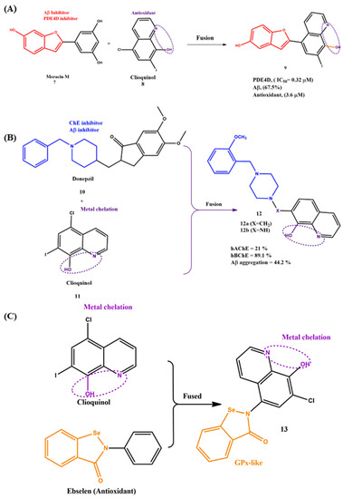 - Prati, F.; Bergamini, C.; Fato, R.; Soukup, O.; Korabecny, J.; Andrisano, V.; Bartolini, M.; Bolognesi, M.L. Novel 8-Hydroxyquinoline Derivatives as Multitarget Compounds for the Treatment of Alzheimer′s Disease. ChemMedChem 2016, 11, 1284–1295. [Google Scholar] [CrossRef]