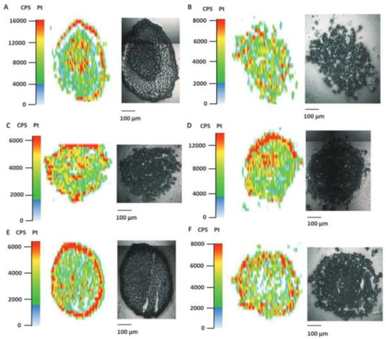 Platinum distribution in cryo-sections of HCT116 and CH1/PA-1 tumor spheroids after treatment with Pt-complexes (1–5 µM) measured by LA-ICP-MS. Reprinted with permission from Ref. [], Copy right year: 2016, copyright owner: Oxford University Press, (A) HCT116 tumor spheroids treated with satraplatin, (B) CH1/PA1 spheroids treated with satraplatin, (C) HCT116 tumor spheroids treated with new “Pt-compound 1”, (D) CH1/PA1 spheroids treated with new “Pt-compound 1”, (E) HCT116 tumor spheroids treated with new “Pt-compound 2”, (F) CH1/PA1 spheroids treated with new “Pt-compound 2”.