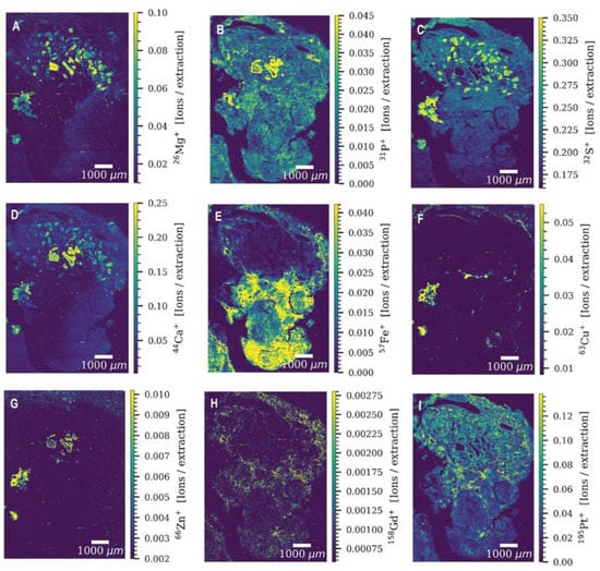 Signal intensity maps of (A) Mg, (B) P, (C) S, (D) Ca, (E) Fe, (F) Cu, (G) Zn, (H) Gd, and (I) Pt in a germ cell tumor tissue section of a patient obtained by LA-ICP-TOFMS imaging. The parallel line scans overlap one another by 10 µm. Reprinted with permission from []. Copy right year: 2020, copyright owner: Oxford University Press.