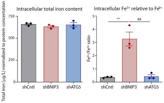 Intracellular total iron content (left) and Fe2+/Fe3+ ratios (right), measured by CE-ICP-DRC-MS in normoxic B16-F10 cells (n = 3). The data are analyzed using a one-way ANOVA with Tukey’s multiple comparisons test. ** p < 0.01 shBNIP3 compared against shCntl, ## p < 0.01 shBNIP3 compared against shATG5.Reprinted, []. Copy right year: 2021, copyright owner: John Wiley and Sons.