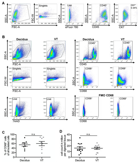 Cell yield and purity—(A) FACS images of isolated cells with CK7 as trophoblast marker and the corresponding FMO. (B) Representative FACS images of isolated cells from decidua and VT. (C) Percentage of CD68+ cells in FACS analysis of decidua (35 gr.) and VT (150 gr.). Data are mean ± S.E.M., n = 8, n.s. p > 0.05 (decidua vs. VT) by Mann–Whitney-U-Test. (D) Dotplots of cell counts in million per digested tissue (35 gr. decidua and 150 gr. VT) of the immune cell layer. Data are mean ± S.E.M., n ≥ 11, n.s. p > 0.05 (decidua vs. VT) by Mann–Whitney-U-Test.