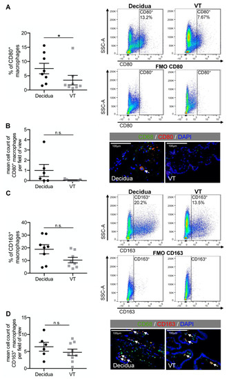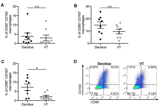 Furthermore, the FACS staining showed that CD80+CD163+ macrophages were increased significantly (p = 0.028 *) in the decidua (7.2% (±1.8%)) compared to the VT (2.1 (±0.7%)) (Figure 3C,D).