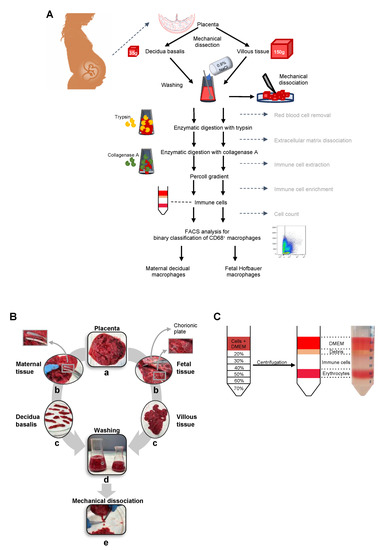 There are several different protocols for the isolation of maternal and fetal macrophages from fresh term placenta. In previous studies, placental macrophages were isolated using various enzymatic digestion steps, density gradients, and immunoselection, mostly by magnetic bead selection and mainly from first trimester placenta.