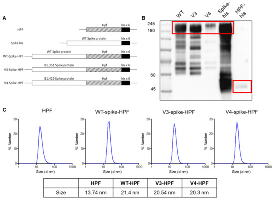 Purified spike conjugated ferritin nanocage samples were quantified by bovine serum albumin assay. For Western blot, equal amounts of each sample were loaded into SDS PAGE. The SDS-PAGE was then transferred into a nitrocellulose membrane, which was blocked for 1 h in 0.5% skim milk/TBS-T. Subsequently, the membrane was incubated with a primary antibody specific for His-tag at 4 °C overnight. The next day, after washing with TBS-T (0.05% Tween-20), the membrane was stained with HRP-conjugated secondary antibodies for 1 h at room temperature. Finally, the results were visualized with ChemiDoc MP Imaging System (BioRad, Hercules, CA, USA). The size of purified spike conjugated ferritin nanocages was analyzed by Zetasizer Nano ZS (Malvern Instrument, Malvern, UK).