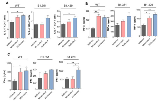 To confirm the variant-specific immune response following the multivalent ferritin nanocage vaccination, we analyzed the cytokine profiles from the CD4+ T cells under B1.351 and B1.429 spike antigen challenges [45]. First, the IL-4 expressing CD4+ T cells in the spleen were analyzed to evaluate the Th2 response directly affecting the B-cell immune response by forming neutralizing antibodies. Briefly, single cell-digested spleen cells were cultured with SARS-CoV-2 spike peptide pools of the wild type (WT) and each variant. As shown in Figure 3A, a proportion of the IL-4+CD4+ T cells significantly increased in the multivalent-ferritin-nanocage-vaccine-treated group when compared to the adjuvant-treated control under the wild-type and B1.429 spike-peptide treatments. BY contrast, the monovalent-vaccine-treated group showed no significant change. In addition, the stimulation with the SARS-CoV-2 spike peptide pool of the B1.351 variant showed an increasing trend in IL-4+CD4+-T-cell proportion in the spleens of the mice treated with the multivalent vaccine, whereas the monovalent-vaccine-treated group did not show any difference in IL-4+CD4+-T-cell proportion.