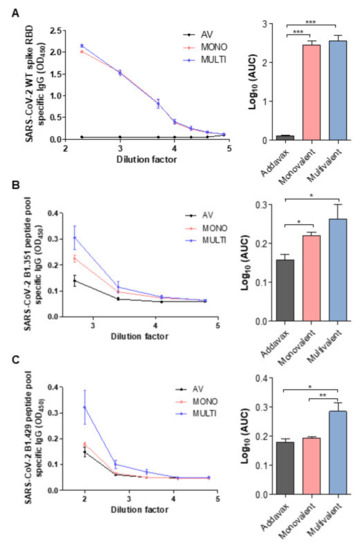 Furthermore, with the B1.351 spike peptide pool, the monovalent- and multivalent-vaccine-treated groups showed higher antigen-specific antibody concentrations than the adjuvant-treated group. This demonstrates the ability of the monovalent vaccine to produce cross-reactive antibodies against the B1.351 peptide pool (Figure 4B). Although not statically significant, the multivalent-vaccine-treated group showed an increasing trend of antigen-specific antibody formation compared with the monovalent-vaccine-treated group. Importantly, the B1.429 peptide pool-specific antibodies were generated only with multivalent vaccination, not with monovalent vaccination (Figure 4C), which was consistent with the results of the IFNγ secretion in the CD4+ T cells (Figure 3C). Altogether, these results suggest that ferritin-nanocage-based multivalent vaccines may protect against SARS-CoV-2 variants.
