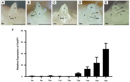 The daughter plants of ‘Benihoppe’ were rooted on 6 June 2018, which was recorded as the 0 week (0 w) (Figure S1). In order to understand the morphological changes and corresponding marker genes of the strawberries during the floral induction, samples were collected weekly from 8 weeks (8 w), and the morphology of the SAMs was observed. We found that SAMs showed no significant changes from 8 w to 13 w and remained in the vegetative stage (Figure 1A,B). Then the SAM looked fatter from 14 w (Figure 1C), it was speculated that the flower meristem was starting, and the SAM shifted to the reproductive stage. Further, the flower primordia could be observed from 15 w with the changes in the environment (Figure 1D,E). By analyzing the expression of the FaAP1 during 8 w–16 w, the results showed that expression gradually increased from 13 w, suggesting that FaAP1 expression is up-regulated prior to the morphological change (Figure 1F).