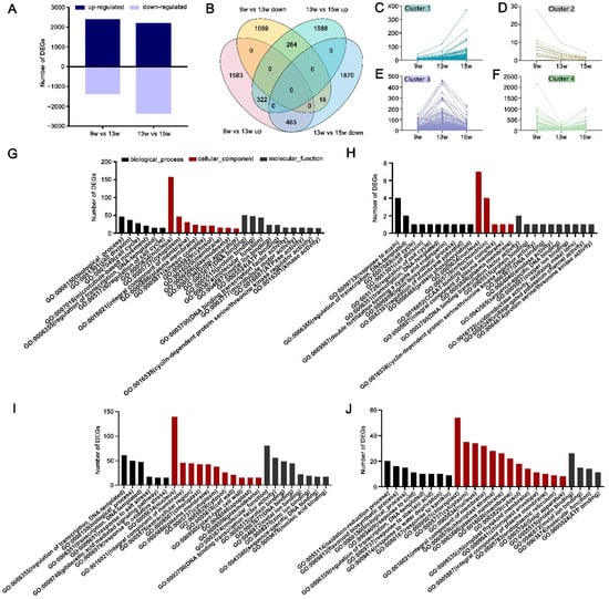 Differential gene expression and GO enrichment analysis during flowering in strawberry. (A) Number of up-regulated and down-regulated DEGs of 13 w and 15 w. (B) Venn diagram of DEGs in the 13 w and 15 w RNA-seq libraries. (C–F) Expression of the DEGs at 9 w, 13 w, and 15 w in clusters 1−4, based on the overlaps in the Venn diagram in panel B. (G–J) GO enrichment analysis of DEGs in cluster 1 (G), cluster 2 (H), cluster 3 (I), and cluster 4 (J).