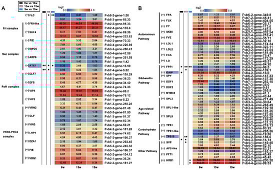 FPKM values of key genes belonging to the different flowering time pathways. (A) Heat map showing the expression of genes involved in the vernalization pathway. (B) Heat maps showing the expression of genes involved in the autonomous, GA, age-related, carbohydrate, and other pathways. (+) indicates the positive regulators of flower bud differentiation in Arabidopsis, and (−) indicates negative regulator. 9 w: vegetative stage, 13 w: shifts to reproductive stage at gene level, 15 w: reproductive stage. The column with the black boxes represents the student’s t test analysis of DEGs at 9 w vs. 13 w; The column with the pink boxes represents the student’s t test analysis of DEGs at 13 w vs. 15 w; The column with the blue boxes represents the student’s t test analysis of DEGs at 9 w vs. 15 w. (* |Log2FC| ≥ 1, p < 0.05. ** |Log2FC| ≥ 2, p < 0.01).