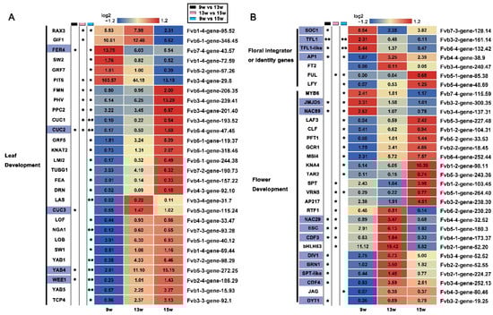 FPKM values of DEGs related to leaf and flower development. (A) Heat map showing the DEGs that may be involved in leaf development. (B) Heat map showing the DEGs that may be involved in flower development. The purple boxes indicate the genes in which expression was significantly changed at 13 w. 9 w: vegetative stage, 13 w: shifts to reproductive stage at gene level, 15 w: reproductive stage. The column with the black boxes represents the student’s t test analysis of DEGs at 9 w vs. 13 w; The column with the pink boxes represents the student’s t test analysis of DEGs at 13 w vs. 15 w; The column with the blue boxes represents the student’s t test analysis of DEGs at 9 w vs. 15 w. (* |Log2FC| ≥ 1, p < 0.05. ** |Log2FC| ≥ 2, p < 0.01).