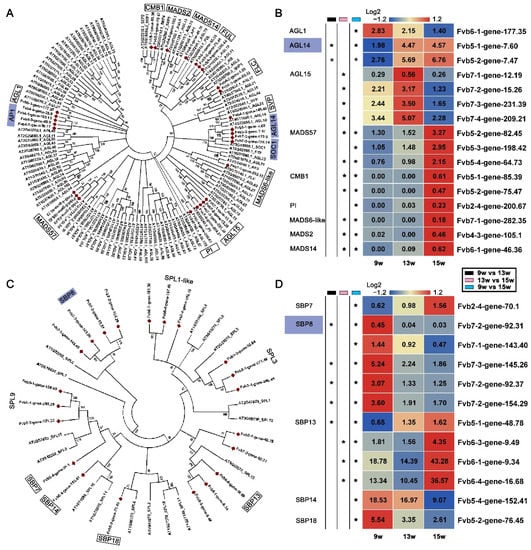 Phylogenetic analyses and relative expression of the DEGs in the MADS and SEB families. (A) Phylogenetic analysis of DEGs in the MADS family. (B) Heatmap showing the relative expression of DEGs in the MADS family. (C) Phylogenetic analysis of DEGs in the SEB family. (D) Heatmap showing the relative expression of DEGs in the SEB family. The purple boxes indicate the genes in which expression was significantly changed at 13 w. 9 w: vegetative stage; 13 w: shifts to reproductive stage at gene level; 15 w: reproductive stage. The column with the black boxes represents the student’s t test analysis of DEGs at 9 w vs. 13 w; The column with the pink boxes represents the student’s t test analysis of DEGs at 13 w vs. 15 w; The column with the blue boxes represents the student’s t test analysis of DEGs at 9 w vs. 15 w. (* |Log2FC| ≥ 1, p < 0.05).