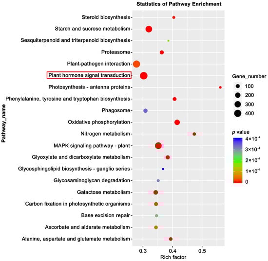 Kyoto Encyclopedia of Genes analysis of DEGs. KEGG pathway analysis of the DEGs showing the top 20 enriched pathways. The most enriched pathway—Plant hormone signal transduction is indicated by the red box.