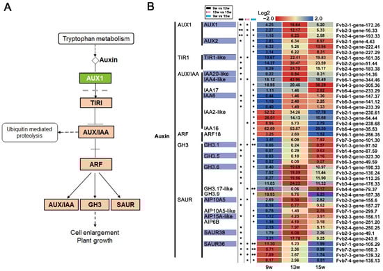 DEGs involved in auxin signaling pathways. (A) Auxin signal transduction pathways by referring to the KO04075 pathway in KEGG enrichment analysis. (B) Heatmaps showing the relative expression of DEGs involved in the auxin. The purple boxes indicate the genes in which expression was significantly changed by 9 w vs. 13 w. 9 w: vegetative stage, 13 w: shifts to reproductive stage at gene level, 15 w: reproductive stage. The column with the black boxes represents the student’s t test analysis of DEGs by 9 w vs. 13 w. The column with the pink boxes represents the student’s t test analysis of DEGs by 13 w vs. 15 w; The column with the blue boxes represents the student’s t test analysis of DEGs by 9 w vs. 15 w. (* |Log2FC| ≥ 1, p < 0.05. ** |Log2FC| ≥ 2, p < 0.01).