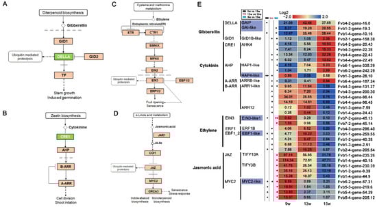 DEGs involved in gibberellin, cytokinin, ethylene, and jasmonic acid signaling pathways. (A–D) Gibberellin, cytokinin, ethylene, and jasmonic acid signal transduction pathways by referring to the KO04075 pathway in KEGG enrichment analysis. (E) Heatmaps showing the relative expression of DEGs involved in the above-mentioned hormone signaling pathways. The purple boxes indicate the genes in which expression was significantly changed by 9 w vs. 13 w. 9 w: vegetative stage, 13 w: shifts to reproductive stage at gene level, 15 w: reproductive stage. The column with the black boxes represents the student’s t test analysis of DEGs by 9 w vs. 13 w; The column with the pink boxes represents the student’s t test analysis of DEGs by 13 w vs. 15 w; The column with the blue boxes represents the student’s t test analysis of DEGs by 9 w vs. 15 w. (* |Log2FC| ≥ 1, p < 0.05. ** |Log2FC| ≥ 2, p < 0.01).
