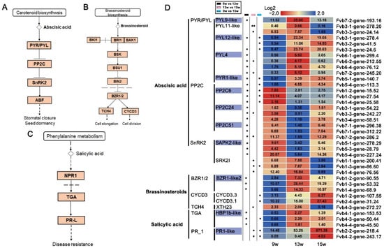 DEGs involved in abscisic acid, brassinosteroid, and salicylic acid signaling pathways. (A–C) Abscisic acid, brassinosteroid, and salicylic acid signal transduction pathways by referring to the KO04075 pathway in KEGG enrichment analysis. (D) Heatmaps showing the relative expression of DEGs involved in the above-mentioned hormone signaling pathways. The purple boxes indicate the genes in which expression was significantly changed by 9 w vs. 13 w. 9 w: vegetative stage, 13 w: shifts to the reproductive stage at the gene level, 15 w: reproductive stage. The column with the black boxes represents the student’s t test analysis of DEGs by 9 w vs. 13 w; The column with the pink boxes represents the student’s t test analysis of DEGs by 13 w vs. 15 w; The column with the blue boxes represents the student’s t test analysis of DEGs by 9 w vs. 15 w. (* |Log2FC| ≥ 1, p < 0.05. ** |Log2FC| ≥ 2, p < 0.01).