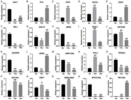 QRT-PCR analysis of 24 strawberry genes that showed differential expression at 9 w, 13 w, and 15 w to verify the RNA-seq data. (A–T) QRT-PCR identification of DEGs mentioned in the above text. Error bars indicate the standard deviation (SD) for three biological replicates. (* p < 0.05, ** p < 0.01).