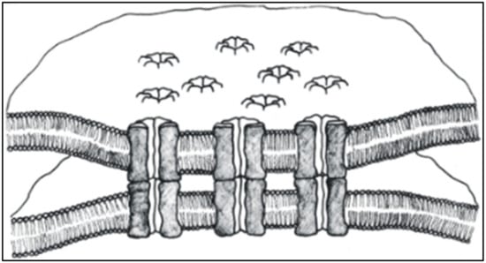 The main differences between these communication systems are the distance between connected cells and the size of the molecules exchanged between connected cells. In the case of gap junction channels and cellular pores, the main limitation of these communication systems is the dilution factor of the cytoplasmic molecules exchanged between communicated cells. Most molecules exchanged by gap junctions/pores are small second messengers up to 1.5 kDa, including cAMP, cGMP, IP3, ATP, calcium, glutamate, aspartate, and small peptides and RNA, but no organelles or big protein complexes can be transferred (see []). Despite that, diffusion of these second messengers is a major limitation; auto regenerative long-range calcium waves going through gap junctions have been described [,]. An example of this long-distance communication system mediated by gap junctions has been observed in the liver but depends on cell-to-cell contact. Hepatocytes expressing vasopressin or glucagon receptors are only localized in the pericentral area of the acini. However, most hepatocytes that respond to vasopressin and glucagon stimulation by degrading glycogen are in the periportal area, at least 100 µm behind the blood flow. Despite this odd localization, upon binding vasopressin or glucagon to their receptors in the pericentral area, retrograde calcium waves are generated and transmitted through gap junctions by an intracellular pathway against the blood flow to reach specialized hepatocytes in the periportal area to release glucose [,]. Thus, even though diffusion is a limitation between gap junctions in communicated cells, several systems evolved to amplify these signals to other communicated cells. In the cell-to-cell pores, the possibilities are multiple, including the transfer of cytoplasmic soluble components, organelles, complexes of organelles, and even genetic material due to the large pore size observed by electron microscopy, 130–140 Å [,] (Figure 4, Figure 5 and Figure 6).