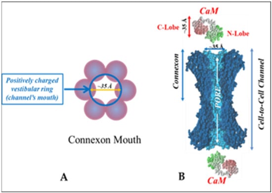 Cork-gating model. Both the positively charged channel’s mouth and the negatively charged CaM lobes are ~35 Å in diameter (A). Therefore, a CaM lobe could fit well in the channel’s mouth (vestibule) and electrostatically interact with it. In (B), the channel is split along its length to display the pore diameter (light blue area) along the channel’s length. Both CaM and connexon images (B) were provided by Dr. Francesco Zonta (Venetian Institute of Molecular Medicine, VIMM, University of Padua, Italy).