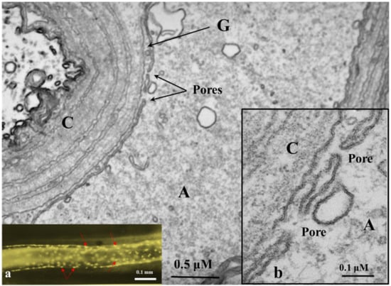 Thin section of an axon of a crayfish abdominal ganglion. Axonal and glial cell plasma membranes fuse, forming two pores (P). Inset “a” shows a fluorescence micrograph of a median giant axon intracellularly injected with Lucifer Yellow CH; note that the nuclei of the adaxonal (sheath) glial cells are stained by the fluorescent dye (Inset “a,” red arrows). Inset “b” is an enlargement of the pore region. A, axon; G, glial cell; C, Adjacent glial connective tissue sheath, non-cellular. The fluorescence micrograph of inset “a” (provided by Dr. Terry A. Viancour) represents a crayfish median giant axon. The electron micrograph is an original, unpublished image taken by one of the authors (C. Peracchia).