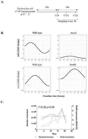 To conclude, in this work, we identified radA as a probable homologous gene for the kaiC clock gene and have shown that its expression as well as that of its partner recA and other genes involved in different functions in E. coli follow a circadian rhythm. It was long assumed that non-cyanobacterial organisms with a very short life cycle would not need a rhythm [], but here we showed circadian oscillations in E coli. Circadian rhythms in pathogenic bacteria opens several research questions, including their involvement in host response and antibiotic resistance. Recently, Kovac et al. showed that the genetic background of E. coli is important for the effect on mammalian circadian clock genes, indicating a possible future use of probiotic strains of E. coli to influence the host circadian clock []. Therefore, pathogenic bacteria could affect the circadian rhythm of the host immune system through their own rhythm.