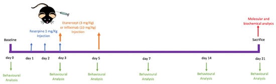Etanercept (3 mg/kg) was intraperitoneally injected the day after the last reserpine injection and on post-injection day 5. Infliximab (10 mg/kg) was intraperitoneally injected the day after the last reserpine injection and on post-injection day 5. The doses of etanercept and infliximab were based on previous studies [64].