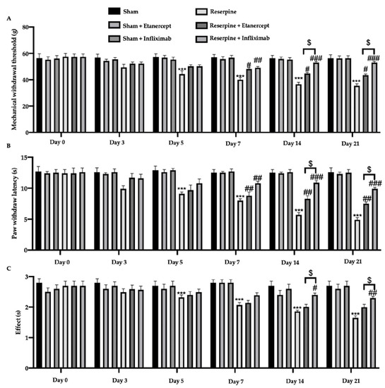 Three days after the first reserpine injection, the animals showed hypersensitivity to mechanical (Figure 2A) and thermal (Figure 2B,C) stimuli as compared to the sham group. The reserpine group showed an increased hypersensitivity, also at different time points, in particular at 5, 7, 14, and 21 days after the first reserpine injection. Etanercept and infliximab treatments importantly attenuated this overreaction (Figure 2A–C). In particular, this effect was prominent in infliximab-treated rats that, from 7 days from the reserpine injection, showed an increased withdrawal threshold and latency. No differences among the sham groups were detected; thus, no other results are shown about the sham + etanercept and sham + infliximab groups.