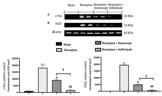 Western blot analyses were conduced to investigate the activation of the expression of the pain-related inflammatory mediators. Lumbar spinal cord tissues collected from the reserpine group showed an increased expression of c-FOS (Figure 3A) and nerve growth factor (NGF) (Figure 3B) as compared to the samples collected from the sham animals. Differently, the samples collected from the etanercept and infliximab groups showed strongly reduced expressions of both mediators. In particular, infliximab showed a stronger effect of inhibition on c-FOS and NGF as compared to etanercept (Figure 3A,B).