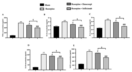 Efficacy of etanercept and infliximab administration on cytokines overexpression reserpine induced. ELISA analysis of: (A) TNF-α, (B) IL-1β, (C) IL-6, (D) IL10 and (E) MCP-1 expressions. For these analyses n = 5 animals fror each group were employed. Results were analysed one-way ANOVA followed by a Bonferroni post-hoc test for multiple comparisons. A p-value <0.05 was considered significant. *** p < 0.001 vs. sham. # p < 0.05 vs. vehicle, ### p < 0.001 vs. vehicle, $ p < 0.05 infliximab vs. etanercept.