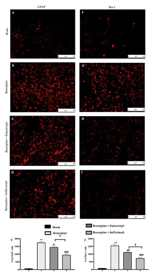 Efficacy of etanercept and infliximab administration on microglia and astrocytes reserpine induced. Immunofluorescence analysis of GFAP: (A) Sham, (B) Reserpine, (C) Reserpine+Etanercept, (D) Reserpine+Infliximab, (E) Number of GFAP positive cells. Immunofluorescence analysis of Iba-1: (F) Sham, (G) Reserpine, (H) Reserpine+Etanercept, (I) Reserpine+Infliximab, (J) Number of Iba-1 positive cells. Scale bar: 75μm. Magnification 40X. For these analyses n = 5 animals for each group were employed. Results were analysed by one-way ANOVA followed by a Bonferroni post-hoc test for multiple comparisons. A p-value <0.05 was considered significant. # p < 0.05 vs. vehicle, ## p < 0.01 vs. vehicle, *** p < 0.001 vs. sham, ### p < 0.001 vs. vehicle, $ p < 0.05 infliximab vs. etanercept.