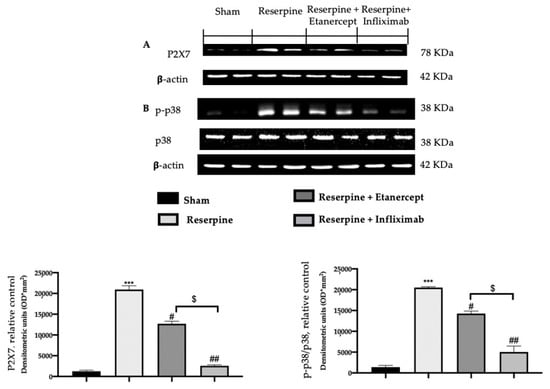 Western blot analysis showed an important increase in the P2X7 expression in lumbar spinal cord harvested from the reserpine group as compared to the sham group. Etanercept and infliximab administrations importantly reduced P2X7 levels (Figure 6A). Additionally, Western blot analysis was employed to evaluate MAPK activation. In particular, p-38 was found phosphorylated in the reserpine group as compared to the sham group (Figure 6B). Etanercept and infliximab treatments significantly reduced its phosphorylation (Figure 6B), but infliximab strongly reduced both proteins’ expressions.