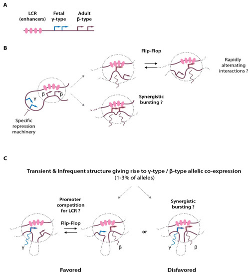 Because most of the current chromatin-looping assays are performed on a population of cells, it only provides an average view of the chromatin contacts, preventing dissecting chromatin contact dynamics in individual cells and on individual alleles. In the original models put forward in the 1980s and 1990s, it was proposed that the different promoters would compete for the access to the enhancers (reviewed in [31]). In this model, the expression of the different globin genes would be mutually exclusive as interaction with the LCR enhancers is needed for proper transcriptional activation. Although this is truly the case between the silenced fetal and adult promoters in adult erythroid cells [32,33], it remains unclear in situations where several active promoters within the same locus rely on common enhancers for their activity. To distinguish whether individual interactions occur simultaneously or in a mutually exclusive manner, two recent elegant studies developed novel dedicated 3C-based approaches (“Tri-C” and Multicontact 4C—“MC-4C”) to enable single-allele detection of multiway chromatin contacts [34,35]. Interestingly, these studies detected multiple simultaneous chromatin contacts between the α- and β-globin enhancers and the globin genes, showing the existence of enhancer hubs (Figure 1A,B). These studies also demonstrated that these hubs can accommodate more than one promoter with the detection of both active adult β-globin gene promoters in close contact with the enhancers. However, it appears clearly that the developmentally silenced fetal globin genes remain mostly excluded from this chromatin topology, as they are subjected to specific repression in adult erythroid cells [33,34,35,36] (see Section 6), although both fetal and adult globin genes may show concomitant expression at low frequency in cell populations [32,37,38] (Figure 1B,C).
