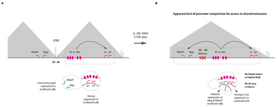 A subsequent study applying Tri-C on erythroid cells with an extended α-globin domain further confirmed the observation that several promoters can colocalize within an enhancer hub [39]. In this model, the deletion of a few base pairs corresponding to two upstream CTCF motifs (located at −38/−39 kb) results in an expansion of the α-globin topological domain [40], with associated increased ectopic contacts of the enhancers with two upstream genes, Mpg and Rhbdf1 which are normally present in the neighboring domain and which do not interact with the α enhancers in wild-type cells (Figure 2A,B). This new chromatin configuration is associated with the up-regulation of Mpg and Rhbdf1 expression offering a unique opportunity to study whether promoter competition takes place within a domain where multiple promoters are regulated by a common set of enhancers. Strikingly, Tri-C highlighted the interaction hubs containing complexes of the α enhancers, the α-globin gene promoters together with the Mpg and Rhbdf1 promoters. Altogether these observations indicate that individual components of an enhancer cluster as present at α- and β-globin loci can therefore spatially aggregate into a single structure that can accommodate several promoters simultaneously for transcriptional activation. As these structures are likely highly dynamic [41,42] and present at relatively low frequencies, they were missed in conventional population-based assays. Importantly, such structures were also observed on the Pcdhα protocadherin gene cluster in fetal brain neurons, showing that these concepts are not specific to the globin genes or to erythroid cells, but represent basic general mechanisms operating at different loci in different tissues [34].