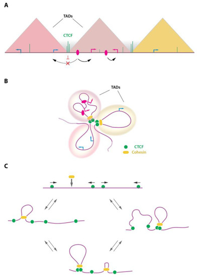 Different levels of chromatin loop or domain formation co-exist in mammalian cells. At the tens to hundreds kilobases scale, chromosomes are folded into so-called Topologically Associating Domains (TADs). The TADs partition our chromosomes and are believed to be involved in the insulation of gene expression and to prevent, to some extent, uncontrolled enhancer promoter communications (Figure 3A,B). In the current models, TADs are formed by a dynamic process known as ‘loop extrusion’ whereby the ring-shaped cohesin complex is loaded on the DNA and progresses along the chromatin fiber (reviewed in [6,26,52]) (Figure 3C). This continuous process leads to an active engulfment of chromatin into the cohesin ring, forming a chromatin loop which progressively increases in size until the cohesin complex stalls at convergently oriented CTCF-bound sites [16,53]. Transient stabilization of such structures gives the characteristic TAD signals and loop domains typically observed in Hi-C whole-genome 3D chromatin maps. It also matches the position of TAD borders, which are believed to prevent communications between regulatory elements and genes belonging to different TADs, and to rather favor intra-TAD chromatin interactions (Figure 3). It should be noted that cohesin can also accumulate at sites devoid of CTCF, including at MCM (Minichromosome maintenance) complex binding sites [54], or by RNA polymerase II at some gene promoters [55,56] and/or at G-rich sequences able to form non-canonical DNA structures such as G-quadruplexes [57]. At the intra-TAD level, chromatin looping favors long-range enhancer-promoter communications at the basis of gene expression regulation. It is believed that the loop extrusion process by the cohesin complex provides a framework to favor such chromatin-chromatin communication within TADs, while disfavoring interactions across borders.