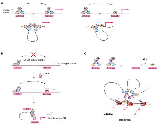 A function for LDB1-mediated loops in the stimulation of transcriptional elongation was suggested at the Myb gene locus, where it was shown that LDB1 recruits the CDK9 kinase at the distal enhancers which would phosphorylate RNA polymerase II serine 2 (a mark of productive elongation) via looping [46,64]. The main enhancer looping sites were clustered on the Myb gene first intron, precisely at the site of the transition between transcription initiation to elongation (Figure 4C). In the presence of CDK9 inhibitor DRB, loops between the distal enhancers and the Myb gene were maintained but failed to activate Myb transcription [46]. These observations indicate that looping is not dependent on active transcriptional elongation (as was shown in other studies [47]), and suggest that at least one function of chromatin loops may be to stimulate transcriptional elongation via long-range chromatin contacts, although distal enhancers may likely influence different steps of the transcription cycle, including transcription initiation, depending on the target gene considered [71].