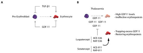 Erythropoiesis is under the control of key signaling pathways regulating progenitor proliferation, survival and differentiation. Besides the well-known roles of SCF/c-KIT signaling to sustain immature progenitors proliferation, and the well-established role of the EPO/EPOR axis [106], and glucocorticoids [107] in erythroblasts survival and maturation, additional pathways were shown to have strong impacts on red cell production. The TGF-β pathway for instance has a strong pro-differentiation action on erythroid progenitors. It was shown that when cultured in the presence of TGF-β1, primary human progenitors undergo a massive proliferation arrest coupled to the entry into terminal differentiation [108,109] (Figure 5A). A more recent study combining profiling of the erythroid proteome with focused CRISPR screen confirmed the importance of this pathway through the identification of the TGF-β receptor TGFBR2 as a key effector of terminal differentiation [110]. This indicates that one role of the TGF-β pathway is to accelerate erythroid differentiation, at the expense of immature progenitor proliferation, hence limiting erythroid cellular output while inducing fast maturation outcome. It should be noted, however, that despite reports showing that pathways activated by extracellular signals such as TGF-β converge on chromatin sites occupied by master erythroid regulators (e.g., GATA1), and hence may modulate their activities [111,112,113], the molecular mechanisms underlying TGF-β functions in erythropoiesis remain poorly understood. Furthermore, the precise role of the TGF-β pathway, and the sources of TGF-β superfamily ligands production within the erythroid niche in vivo remain poorly characterized. One role of this pathway on erythroid cells may be to restrict and/or to fine-tune the daily production of erythroid cells in the body. The demonstration of the clinical importance of TGF-β signaling in erythroid disorders in vivo came from the discovery that ineffective erythropoiesis in β-thalassemia is to a large extent the result of aberrant TGF-β superfamily signaling [114,115]. It was shown that in mouse models of thalassemia, extramedullary splenic stress erythropoiesis is associated with overexpression of the TGF-β superfamily ligand GDF11. GDF11 is produced by immature erythroblasts, probably as a consequence of increased oxidative stress in thalassemic erythroblasts, and acts in an autocrine fashion to maintain progenitor proliferation and inhibit terminal differentiation (Figure 5A). Increased serum GDF11 levels were also detected in thalassemia patients, confirming the data obtained in mice. Importantly, the use of the activin receptor ligand traps Sotatercept (ACE-011) or ACE-536 in humans, or RAP-011 (the mouse equivalent) leads to efficient inhibition of GDF11 signaling, and restoration of hematologic parameters, suggesting that GDF11 is a major component of the ineffective erythropoiesis in thalassemia. This important discovery of the TGF-β1/GDF11 imbalance impairing erythroid differentiation in thalassemic models represents a major therapeutic opportunity that led to FDA and EMEA approval of the Luspatercept, a trap receptor of GDF-11 [116,117] (Figure 5B). Surprisingly, GDF11-induced signaling in erythroblasts activates the SMAD2/3 intracellular effectors, similar to TGF-β1, whereas the effects mediated by those two ligands result in completely opposing outputs (i.e., proliferation of progenitors and inhibition of terminal differentiation by GDF11 as opposed to decreased progenitor proliferation and accelerated differentiation by TGF-β1). The molecular mechanisms acting downstream of GDF11/TGF-β1 remain unclear and warrant further investigation.