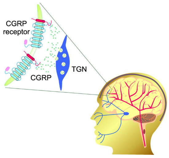 - Raddant, A.C.; Russo, A.F. Calcitonin gene-related peptide in migraine: Intersection of peripheral inflammation and central modulation. Expert Rev. Mol. Med. 2011, 13, e36. [Google Scholar] [CrossRef]