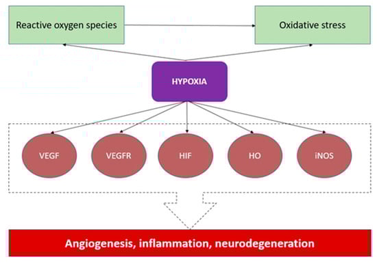 Oxygen homeostasis is essential for metabolism, tissue repair, regeneration, ageing, and normal physiology. Hypoxia is the presence of a lower-than-normal oxygen content and pressure in the cell []. A hypoxic environment can occur via the up- and downregulation of the gene expression and the secretion of chemokines and other biologically active substances. Hypoxia could switch on adaptative pathways, which might also be considered the required compounds of “oxidative stress” or “mitochondrial function”. They all form the background of disease pathogenesis in human and animal bodies (Figure 1) [,]. For instance, hypoxia upregulates mRNA in genes, including ALDOA (aldolase, fructose-bisphosphate A), ENO1 (alpha-enolase), LDHA (lactate dehydrogenase A), VEGF-A (vascular endothelial growth factor-A, also VEGF), PFKFB3 (6-Phosphofructo-2-Kinase/Fructose-2,6-Biphosphatase 3), and SLC2A1 (Solute Carrier Family 2 Member 1) []. In addition, hypoxia is often discussed in the context of the tumour microenvironment and inflammation [,] because the hypoxic local microenvironment stimulates the secretion of chemokines that impact nearby tissue. This phenomenon has already been described in oncological diseases [,,]. Chronic hypoxia promotes tissue repair via fibrosis development [], while “inflammatory hypoxia” stimulates the proliferation of neutrophils and monocytes and the activation of oxygen-consuming enzymes []. The oxygen gradient is essential for physiological immunological niches (placenta, bone marrow, lymph nodes, gastrointestinal tracts) and is crucial for hypoxia-inflammation signalling crosstalk [,,]. Chronic inflammation as chronic hypoxia is a trigger for carcinogenesis [,,]. The production of hypoxia-inducible factor (HIF)-1 has been induced by hypoxia, which also stimulates inducible nitric-oxide-synthase (iNOS) production. Intracellular nitrogen species (RNS) and reactive oxygen species (ROS) rise as a consequence, which results in DNA damage [,]. Kawanishi et al. stress that tumour-producing inflammation could induce nuclear factor-κB, resulting in iNOS-dependent DNA damage []. Meanwhile, immunity also indirectly correlates with the hypoxia level—HIF plays a role in regulating innate and adaptive immunity []. In macrophages, the expression of HIF-1 correlates with glycolysis, ATP generation, cytokine production, bacterial killing, and migration/invasion. In neutrophils, HIF-1 mostly correlates with killing bacteria []. Wobben et al. show that the HIF-1α protein is required for the adequate production of interferon-α and -β []. The differentiation of T-lymphocytes occurs upon HIF production [], whereas, in B-lymphocytes, HIF also impacts survival, development, and antibody processing [,]. Moreover, Taylor et al. describe six anatomic-histological units with “physiological hypoxia”, which is characterised by the naturally low partial pressure of oxygen: the intestinal mucosa, the renal medulla, the bone marrow, the placenta, the retina, and the light zone of the germinal centres of lymph nodes []. Alpha-enolase, which is upregulated in hypoxia, is essential for cancer invasion and impacts the humoral and cellular immune response [].
