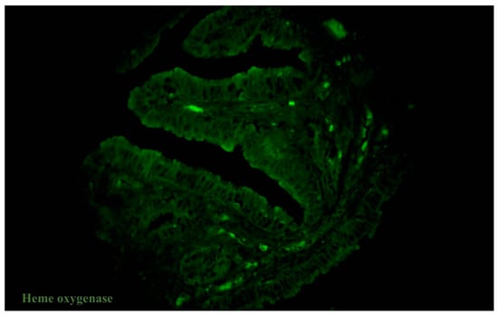 Heme oxygenase-1 (HO-1) has a cytoprotective effect on cellular stresses and oxidative injury, and overexpression might also be connected to the progression of neurodegeneration and carcinogenesis []. HO-1 is usually connected to neurodegenerative diseases, cardiovascular diseases, cancer, metabolic diseases, iron-metabolism disorders, and various inflammatory diseases []. Liong et al. demonstrate that the HO-1 gene and protein expression were raised in terms of labouring myometrium, while, in nonlabouring myometrium, it was not []. In terms of labouring myometrium, it has been characterised by the overexpression of progesterone receptors and changes in the proinflammatory marker profiles [,]. Moreover, the progesterone gene expression was changed in the cultured myometrial tissue on the basis of the period of pregnancy []. The number of TCs in the myometrium also changes on the basis of the reproductive stage. Myometrial TCs decreased in the pregnant uterus and rose postpartum []. It has been reported that TCs constitute about 7% of the total cell numbers in nonpregnant myometrial cell cultures, and about 3% of the entire cell population in the myometrium of adult nonpregnant humans [,]. Previously, we showed a reduction in the number of TCs in the foci of myoma, compared to the adjacent myometrium and unaffected by uterus myoma []. The opposite tendency was common for oviductal TCs—in the oviductal tissue samples from patients with uterine myoma, we observed more telocytes than in the control group []. The difference in the number of cells in pregnant and nonpregnant uteri emphasises its involvement in the myogenic contractile mechanisms []. In addition, TCs are susceptible to hypoxia [,] and are involved in tissue repair. We focused our attention on HO-1′s role in oxidative stress and inflammation, observing a correlation with TCs. HO-1 is also associated with the regulation of the coagulation/fibrinolytic system. Patients with uterine myoma have oviducts with increasing amounts of telocytes and a lower expression of HO-1. We hypothesised that low HO-1 expression leads to a reduction in oxidation resistance, while rising telocytes might have a secondary regenerative compensatory function.