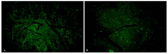 Samples of human oviduct stained for NOS (green, Alexa Fluor 488) in the control (A) and study (B) groups. Total magnification: ×200.