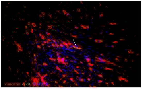 Double immunolabelling of tissue sample from uterine myoma stained for vimentin (red, Alexa Fluor 594) and c-kit (green, Alexa Fluor 488). Nuclei stained by DAPI. Doubly immunopositive cell with oval-shaped body and cellular prolongation identified as a telocyte (marked by an arrow). Total magnification: ×400.