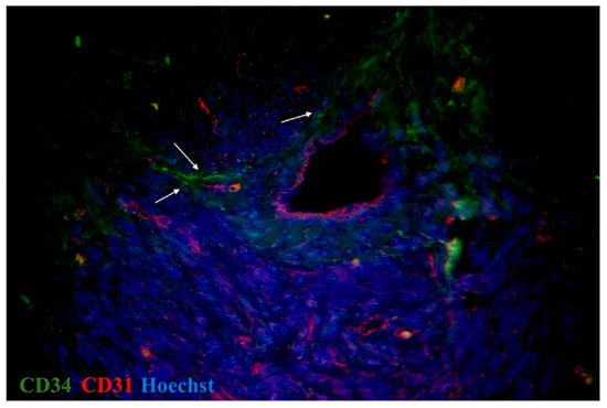 Double immunolabelling of human myometrium stained for CD31 (red, Alexa Fluor 594) and CD34 (green, Alexa Fluor 488) from control. Nuclei stained by Hoechst 33342. Doubly immunopositive cell with long cellular prolongation identified as telocytes (marked by arrows). Total magnification: ×400.