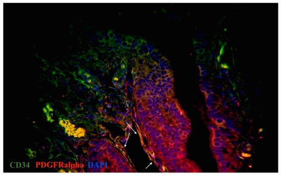 Double immunolabelling of human oviduct stained for PDGFRα (red, Alexa Fluor 594) and CD34 (green, Alexa Fluor 488) in study group. Nuclei stained by DAPI. Doubly immunopositive cell with an oval-shaped body and long cellular prolongation identified as telocytes (marked by arrows). Total magnification: ×400.