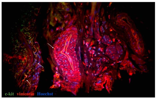 Tissue samples from human oviduct from control group stained for vimentin (red, Alexa Fluor 594) and c-kit (green, Alexa Fluor 488). Nuclei stained by Hoechst 33342. Doubly immunopositive cell with oval-shaped body and long cellular prolongation identified close to blood vessels and within tunica muscularis–oviductal telocytes (marked by arrows). Total magnification: ×400.