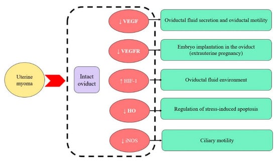 HIF-1 is expressed in all cell types and plays a role in the cellular response to hypoxia, immune-cell adaptation, the expression of immune genes, inflammatory processes, and immunosuppression in tumours [,]. Hypoxia may impact the oviductal and uterine fluid environments []. Luo et al. show that VEGF (HIF target gene) stimulates the fertilisation and maturation of bovine oocytes. In rats, hypoxia also impacts reproduction and fertility [,]. He et al. describe that the adaptation of reproduction in hypoxic conditions is associated with a greater expression of HIF-1α in the reproductive axis of female yaks []. The HIF-1 expression in oviductal tissue increased in patients with uterine myoma, reflecting accession to the pathology of the uterus disorders in the oviduct.