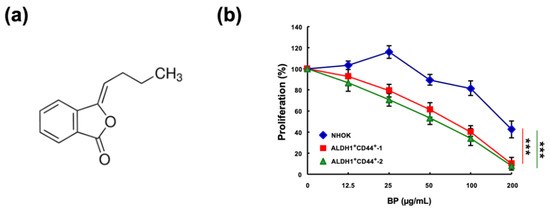 The cytotoxic effect of butylidenephthalide on the viability of normal human oral keratinocyte (NHOK) and patient-derived ALDH1+/CD44+ cells. (a) Chemical structures of butylidenephthalide; MTT assay was utilized to examine the cell viability of (b) NHOK and two patient-derived ALDH1+/CD44+ cells in response to butylidenephthalide at 12.5, 25, 50, 100, and 200 μg/mL. Results are presented as means ± SD of three independent experiments; *** p < 0.001 compared to NHOK. Butylidenephthalide (BP).