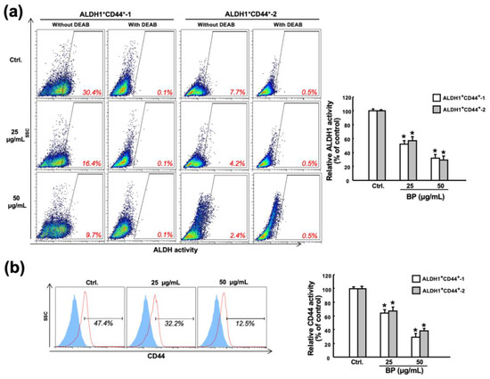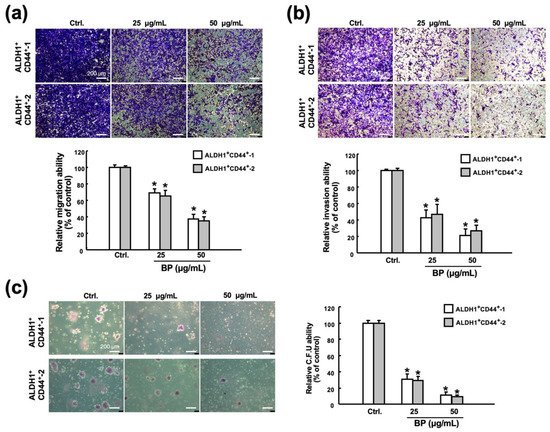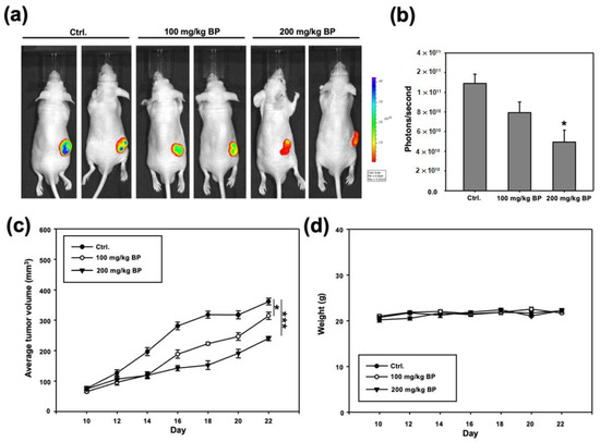 All procedures were conducted in accordance with the guidance of the Institutional Animal Care and Use Committee (IACUC) of the Chung Shan Medical University. The 4–5-week-old female immunodeficient nude mice (BALB/c AnN.CgFoxnnu/Crl Narl mice) were obtained from the National Laboratory Animal Center and were used for the xenograft model. The GFP-labeled ALDH1+/CD44+-1 cells were injected subcutaneously into the right front axilla. Then, 10 days post-implantation, the mice were randomly divided into three groups and treated with vehicle alone (Vitamin K, 10 mg/mL), and the experimental group was treated with different doses of BP (100 or 200 mg/kg). An IVIS 50 Imaging Systems (Xenogen Corporation, Alameda, CA, USA) was used for bioluminescence imaging, and the animals were monitored until day 22. The volume was calculated according to the formula, [length × width2]/2, and then analyzed using Image-Pro Plus software. Body weight was assessed daily after cell injection [51].