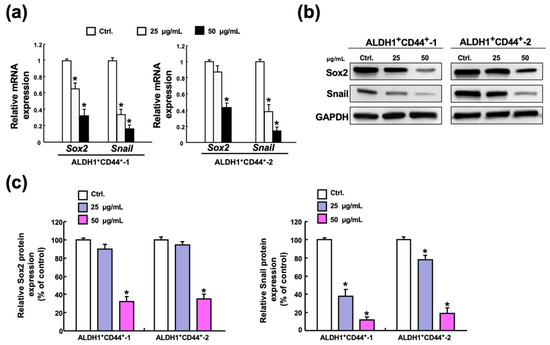 Proteins’ concentrations in whole cell lysate were quantitated using the Bradford protein assay (Bio-Rad, Santa Rosa, CA, USA) according to the manufacturer’s instructions. Whole cell lysates with 2× Laemmli Sample Buffers (Bio-Rad, CA, USA) were denatured by boiling at 95 °C for 10 min and were subjected to 10% (w/v) dodecyl sulfate polyacrylamide gel electrophoresis (SDS-PAGE). Fractionated proteins were then wet-transferred to a polyvinylidene difluoride (PVDF) membrane (Amersham, Arlington Heights, IL, USA) and immersed in the 5% (w/v) BSA blocking solution (MilliporeSigma, Darmstadt, Germany). The primary antibodies against Sox2 and Snail were purchased from Santa Cruz Biotechnology, Inc. (Santa Cruz, CA, USA). Following the primary antibodies, the membranes were incubated with the corresponding secondary antibodies. The immunoreactive bands were developed using an ECL-plus chemiluminescence substrate (Perkin-Elmer, Waltham, MA, USA) and captured by LAS-1000 plus Luminescent Image Analyzer (GE Healthcare, Piscataway, NJ, USA) [53].