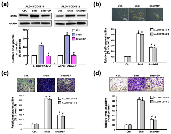 Butylidenephthalide diminishes numerous characteristics of CSCs through downregulation of Snail. (a) Overexpression of Snail in ALDH1−/CD44− cells followed by treatment with or without butylidenephthalide. The enhanced (b) self-renewal, (c) migration, and (d) invasion abilities in the Snail-overexpressing ALDH1−/CD44− cells were all inhibited after butylidenephthalide treatment. Data are shown as the mean ± SD of three independent experiments; * p < 0.05 compared to Ctrl (control group; transfection with control vector); # p < 0.05 compared to the Snail-overexpressing ALDH1−/CD44− cells without-treatment group. Butylidenephthalide (BP). Scale bar indicate 200 μm.