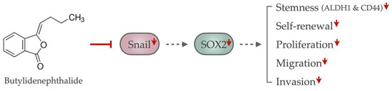 In conclusion, we demonstrated that butylidenephthalide may serve as a suitable adjunct for oral cancer treatment as it was able to eliminate CSCs without greatly damaging normal cells. We showed that downregulation of Snail by butylidenephthalide resulted in the diminished self-renewal and propagating capacities of oral CSCs (Figure 7). The in vitro and in vivo evidence both support the promising role of butylidenephthalide in oral cancer therapy.